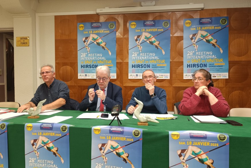 Nous nous retrouvons aujourd'hui pour la première conférence de presse de l'année 2025. Le samedi 18 janvier prochain se tiendra à Hirson le 28ᵉ Meeting de Saut en Hauteur d’Hirson, qui aura lieu au gymnase Georges Hébert.